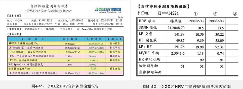 患者至診所初診時,其HRV自律神經活性極低,為「氣若游絲型」。51歲男性之自律神經整體活性(SDNN)標準為21.20,他只有10.50。交感神經活性(LF)標準為141.89,他只有10.59,副交感神經活性(HF)標準為49.87,他只有9.39。總能量應為191.76,他只有19.97(圖4-41)