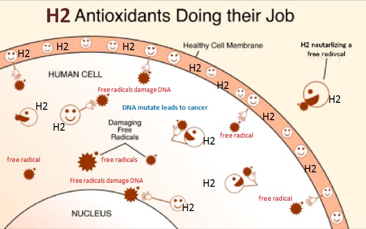 Hydrogen Molecules acting as strong antioxidants fights free radicals that slowly destroy your cell. These dangerous free radicals multiply by chain reaction, breaking up stable molecules in our cell and forming more free radicals. The continuous destruction of our cell molecules by these free radicals greatly affected their cellular function which finally lead to the breakdown of the cell DNA and destruction of the blood protein. These relentless attack finally caused total breakdown of the cellular function in the affected area and this lead to cancer.